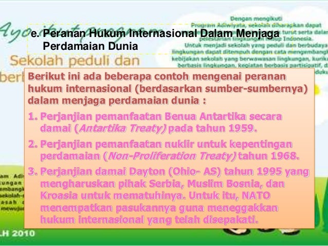 - 12. e. Peranan Hukum Internasional Dalam Menjaga Perdamaian Dunia Berikut ini ada beberapa contoh mengenai peranan hukum internasional (berdasarkan sumber-sumbernya) dalam menjaga perdamaian dunia : 1. Perjanjian pemanfaatan Benua Antartika secara damai (Antartika Treaty) pada tahun 1959. 2. Perjanjian pemanfaatan nuklir untuk kepentingan perdamaian (Non-Proliferation Treaty) tahun 1968. 3. Perjanjian damai Dayton (Ohio- AS) tahun 1995 yang mengharuskan pihak Serbia, Muslim Bosnia, dan Kroasia untuk mematuhinya. Untuk itu, NATO menempatkan pasukannya guna meneggakkan hukum internasional yang telah disepakati.