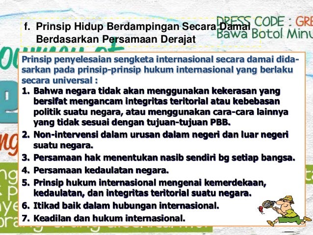 - 13. f. Prinsip Hidup Berdampingan Secara Damai Berdasarkan Persamaan Derajat Prinsip penyelesaian sengketa internasional secara damai dida- sarkan pada prinsip-prinsip hukum internasional yang berlaku secara universal : 1. Bahwa negara tidak akan menggunakan kekerasan yang bersifat mengancam integritas teritorial atau kebebasan politik suatu negara, atau menggunakan cara-cara lainnya yang tidak sesuai dengan tujuan-tujuan PBB. 2. Non-intervensi dalam urusan dalam negeri dan luar negeri suatu negara. 3. Persamaan hak menentukan nasib sendiri bg setiap bangsa. 4. Persamaan kedaulatan negara. 5. Prinsip hukum internasional mengenai kemerdekaan, kedaulatan, dan integritas teritorial suatu negara. 6. Itikad baik dalam hubungan internasional. 7. Keadilan dan hukum internasional.