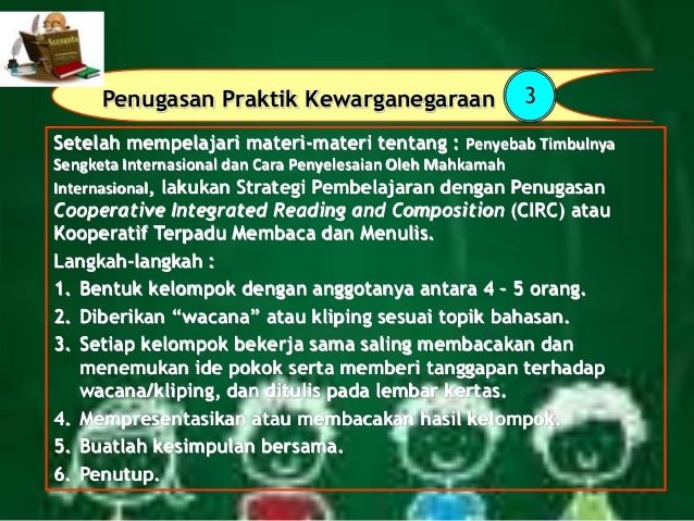 - 14. Penugasan Praktik Kewarganegaraan 3 Setelah mempelajari materi-materi tentang : Penyebab Timbulnya Sengketa Internasional dan Cara Penyelesaian Oleh Mahkamah Internasional, lakukan Strategi Pembelajaran dengan Penugasan Cooperative Integrated Reading and Composition (CIRC) atau Kooperatif Terpadu Membaca dan Menulis. Langkah-langkah : 1. Bentuk kelompok dengan anggotanya antara 4 – 5 orang. 2. Diberikan “wacana” atau kliping sesuai topik bahasan. 3. Setiap kelompok bekerja sama saling membacakan dan menemukan ide pokok serta memberi tanggapan terhadap wacana/kliping, dan ditulis pada lembar kertas. 4. Mempresentasikan atau membacakan hasil kelompok. 5. Buatlah kesimpulan bersama. 6. Penutup.