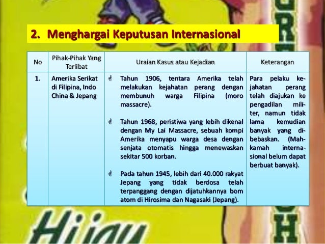 - 15. 2. Menghargai Keputusan Internasional No Pihak-Pihak Yang Terlibat Uraian Kasus atau Kejadian Keterangan 1. Amerika Serikat di Filipina, Indo China & Jepang Tahun 1906, tentara Amerika telah melakukan kejahatan perang dengan membunuh warga Filipina (moro massacre). Tahun 1968, peristiwa yang lebih dikenal dengan My Lai Massacre, sebuah kompi Amerika menyapu warga desa dengan senjata otomatis hingga menewaskan sekitar 500 korban. Pada tahun 1945, lebih dari 40.000 rakyat Jepang yang tidak berdosa telah terpanggang dengan dijatuhkannya bom atom di Hirosima dan Nagasaki (Jepang). Para pelaku ke- jahatan perang telah diajukan ke pengadilan mili- ter, namun tidak lama kemudian banyak yang di- bebaskan. (Mah- kamah interna- sional belum dapat berbuat banyak).