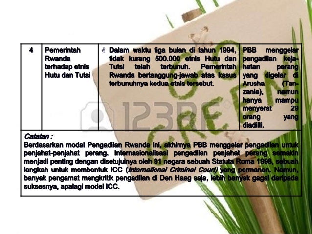 - 17. 4 Pemerintah Rwanda terhadap etnis Hutu dan Tutsi Dalam waktu tiga bulan di tahun 1994, tidak kurang 500.000 etnis Hutu dan Tutsi telah terbunuh. Pemerintah Rwanda bertanggung-jawab atas kasus terbunuhnya kedua etnis tersebut. PBB menggelar pengadilan keja- hatan perang yang digelar di Arusha (Tan- zania), namun hanya mampu menyerat 29 orang yang diadilli. Catatan : Berdasarkan modal Pengadilan Rwanda ini, akhirnya PBB menggelar pengadilan untuk penjahat-penjahat perang. Internasionalisasi pengadilan penjahat perang semakin menjadi penting dengan disetujuinya oleh 91 negara sebuah Statuta Roma 1998, sebuah langkah untuk membentuk ICC (International Criminal Court) yang permanen. Namun, banyak pengamat mengkritik pengadilan di Den Haag saja, lebih banyak gagal daripada suksesnya, apalagi model ICC.