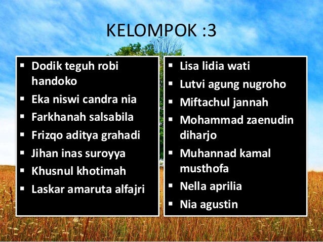 - 2. KELOMPOK :3 Dodik teguh robi handoko Eka niswi candra nia Farkhanah salsabila Frizqo aditya grahadi Jihan inas suroyya Khusnul khotimah Laskar amaruta alfajri Lisa lidia wati Lutvi agung nugroho Miftachul jannah Mohammad zaenudin diharjo Muhannad kamal musthofa Nella aprilia Nia agustin