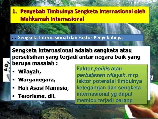 - 4. 1. Penyebab Timbulnya Sengketa Internasional oleh Mahkamah Internasional a. Sengketa Internasional dan Faktor Penyebabnya Sengketa internasional adalah sengketa atau perselisihan yang terjadi antar negara baik yang berupa masalah : Wilayah, Warganegara, Hak Asasi Manusia, Terorisme, dll. Faktor politis atau perbatasan wilayah, mrp faktor potensial timbulnya ketegangan dan sengketa internasional yg dapat memicu terjadi perang terbuka.