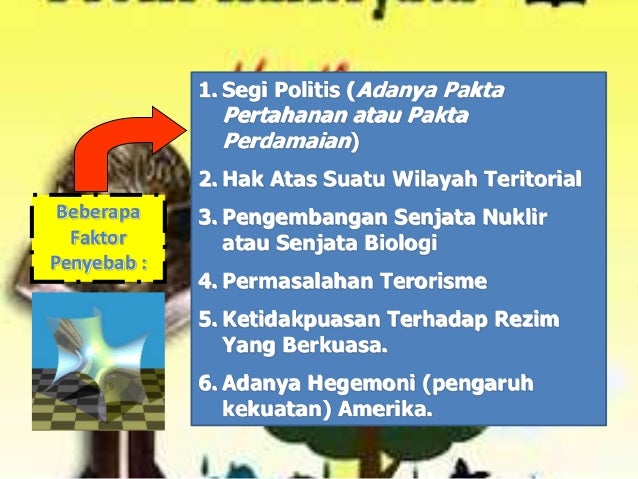 - 5. 1. Segi Politis (Adanya Pakta Pertahanan atau Pakta Perdamaian) 2. Hak Atas Suatu Wilayah Teritorial 3. Pengembangan Senjata Nuklir atau Senjata Biologi 4. Permasalahan Terorisme 5. Ketidakpuasan Terhadap Rezim Yang Berkuasa. 6. Adanya Hegemoni (pengaruh kekuatan) Amerika. Beberapa Faktor Penyebab :