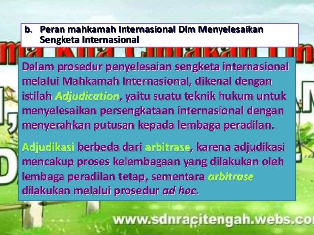 - 6. b. Peran mahkamah Internasional Dlm Menyelesaikan Sengketa Internasional Dalam prosedur penyelesaian sengketa internasional melalui Mahkamah Internasional, dikenal dengan istilah Adjudication, yaitu suatu teknik hukum untuk menyelesaikan persengkataan internasional dengan menyerahkan putusan kepada lembaga peradilan. Adjudikasi berbeda dari arbitrase, karena adjudikasi mencakup proses kelembagaan yang dilakukan oleh lembaga peradilan tetap, sementara arbitrase dilakukan melalui prosedur ad hoc.