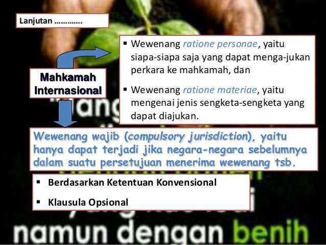 - 7. Lanjutan …………. Wewenang ratione personae, yaitu siapa-siapa saja yang dapat menga-jukan perkara ke mahkamah, dan Wewenang ratione materiae, yaitu mengenai jenis sengketa-sengketa yang dapat diajukan. Mahkamah Internasional Wewenang wajib (compulsory jurisdiction), yaitu hanya dapat terjadi jika negara-negara sebelumnya dalam suatu persetujuan menerima wewenang tsb. Berdasarkan Ketentuan Konvensional Klausula Opsional