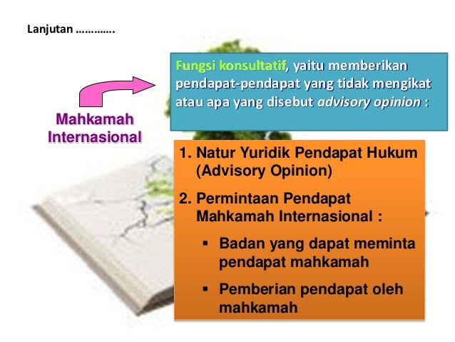 - 8. Lanjutan …………. Mahkamah Internasional Fungsi konsultatif, yaitu memberikan pendapat-pendapat yang tidak mengikat atau apa yang disebut advisory opinion : 1. Natur Yuridik Pendapat Hukum (Advisory Opinion) 2. Permintaan Pendapat Mahkamah Internasional : Badan yang dapat meminta pendapat mahkamah Pemberian pendapat oleh mahkamah