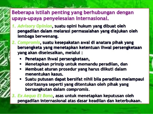 - 9. Beberapa istilah penting yang berhubungan dengan upaya-upaya penyelesaian Internasional. 1. Advisory Opinion, suatu opini hukum yang dibuat oleh pengadilan dalam melarasi permasalahan yang diajukan oleh lembaga berwenang. 2. Compromis, suatu kesepakatan awal di anatara pihak yang bersengketa yang menetapkan ketentuan ihwal persengketaan yang akan diselesaikan, melalui : Penetapan ihwal persengketaan, Menetapkan prinsip untuk memandu peradilan, dan Membuat aturan prosedur yang harus diikuti dalam menentukan kasus. Suatu putusan dapat bersifat nihil bila peradilan melampaui otoritasnya seperti yang ditentukan oleh pihak yang bersangkutan dalam compromis. 3. Ex Aequo Et Bono, asas untuk menetapkan keputusan oleh pengadilan internasional atas dasar keadilan dan keterbukaan.